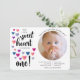 Raring, första födelsedagsinbjudan. Lila, blått och rosa vattenfärgshjärtan med ett foto av ettåringen! Judiska toner på en skarp vit bakgrund, inbjudan är den sötaste.