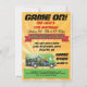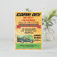 Supercoola Game Truck-födelsedagsfestinbjudningar för den som älskar tv-spel. Utformade i en livfull affischstil med solstrålebakgrund, Game Truck-fordon med fantastisk grafik och gott om utrymme på båda sidor för din festinformation. Perfekt för alla åldrar, födelsedagar eller till och med företagsfester. Handritad illustration av McBooboo.