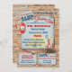 Rolig och fantastisk inbjudan till Glamping-fest med tält, lykta, lägereld och rostad marshmallow på gammalt vintagepapper mot en rustik träbakgrund. Perfekt för tjejkväll, pyjamasparty, födelsedagsfest eller möhippa. Handritad illustration av McBooboo.