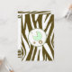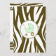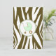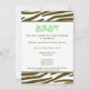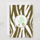 En inbjudan som innehåller en brun zebra tryck-gräns överst och grund med ljust grönt trim. Anpassa den bruna och grönt tango- och blacklettsteckentexten med information om händelsen. På motsatt sida finns ett massivt zebra tryck med en baby i grönt inuti en passande cirkel i form av ram.