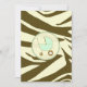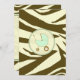 En inbjudan som innehåller en brun zebra tryck-bakgrund över varmt beige med ljust grönt trim. Anpassa den bruna texten med information om händelsen. På motsatt sida finns ett massivt zebra tryck med en baby i grönt inuti en passande cirkel i form av ram.