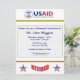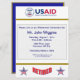 Denna blåa inbjudan och inbjudan från guld har utformats tillsammans med logotypen United Stater Agency for Internationell Development (USAID). Baksidan är dekorerad med logotypen USAID och ord "Tillbakadraget".