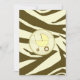 En inbjudan med brun zebra tryck-bakgrund över varmt beige med lätt gult. Anpassa den bruna texten med information om händelsen. På motsatt sida finns ett massivt zebra tryck med en baby i gult inuti en passande cirkel i form av ram.