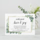 Greenery Eucalyptus, med underbarare kärlek och glädje, Bröllop repeterminicett för middagsinbjudan. Planerar du en bröllop-dagslång firande med den blivande Briden och att bli Groom, före deras högtid? Inbjudan gästerna med det här Rustic Bröllop repeterkortet för middag. Lägg till information om repetitionsmiddagen i matchande svart teckensnitt/text.