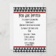 En enkel inbjudan med ett hundtandsmönstrat design överst och nederst på framsidan. röd kant och retro-font. Anpassa med detaljer om ditt evenemang. Baksidan har ett enfärgat design med en cirkelform i mitten, som ramar in texten.