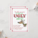 Den här roliga inbjudan har en ljusvit bakgrund med en röd ram. I ljusröd och grönt roligt typsnitt står det: "Det är säsong till sten Ugly Sweaters." Under högerna finns det en roligt som illustrerar en hjort med kor-ögon som bär en röd vit och grönt tröja. Nedan visas din inbjudan. "På att ta itu! På Ruffled! På Loud och Gawdy! Kom Sequined! Kom Glitted! Kom Fringed och Shoddy!" På baksidan står det: "Ta bort alla för att köpa den grymmaste julgossen du kan hitta! Ni har lurat dem i butiker och kanske till och med krämt vid synen, men nu har ni chansen att köpa en åt er själv! Äkta svettare är ett måste om du vill komma in i årets Party i Taciest! Om När: OSA:" Denna inbjudan skulle vara en perfekt för en familjeförsamling, ett grannskap eller en julfest.