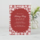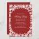 Ljusvit snöflingor på en kranröd bakgrund dekorerar denna Julfest Bjud in. Om det behövs fler objekt i den här samlingen kan du kontakta oss på prettyfancyinvites@gmail.com med din begäran.