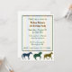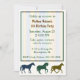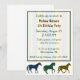Barnets födelsedagsfest inbjudan med bilder av färglösa hästar, på grund och en svag strimmig ruta i textområdet. Anpassa grönten och brunt text till kostym som party behöver. Underbara inbjudningar till tittar för flickor eller pojkar.