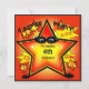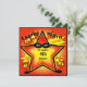 En grafisk design med en ljus superhjältestjärna på en inbjudan till barnkalas. Inbjudan har textmallar för personalisering.