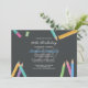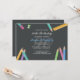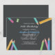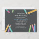 En kalkbräda, färgpennor, en blyertspenna och en linjerörelse på lärarens födelsedagsinbjudan. Ändra bakgrundsåret så att det återspeglar det födelseår du firar.
