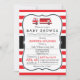 Cute, elegant röd eld lastbil Tema babyduscha inbjudan på ljusröd och vit rand mönster med vintagens formella utseende. Underbar för lastbil, babyduschar i eldkomatter. Forminbjudan för Retroparenteser. Neutraltens inbjudan till pojke eller flicka.