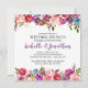 Grymt visning av sommarblommor i övre och grund blommigt gräns. Ljusa rosa vattenfärgblommor accentuerade med djup lila, röd och blå. Många greer och löv behållor designljuset och håret. Bröllop paret namn är djupt lila och det är också bakgrunden. Mycket söt sätt att införliva lila, som är ett mycket populärt färg i år.