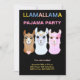 Inbjudningskort till Llama pyjamasparty. Firar en födelsedagsfest eller bara en pyjamasfest. Tre söta lamor på svart bakgrund. Flerfärgat stjärnmönster på baksidan. Texten är redo att anpassas. Ordet llama betyder flera saker. Llama på spanska betyder att kalla och låga (helig). När man läser det baklänges blir det Am All. Lamor är kända för sin vänlighet, enhet och medkänsla. Ha kul på din pyjamasparty!!