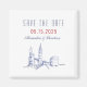 Enkelt, modernt, minimalistiskt inbjudande till elegant London bröllop spara datum med en unik konststad teckning i blå och röd färg.