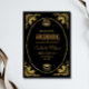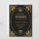 De glamorösa bröllopsinbjudningarna har en modern och halvklassisk konst. En ornat, guld blomkonst ram och prydnadation dekorerar en elegant mörk onyx-black bakgrund för ett dramatiskt utseende, vintage bröllop.