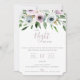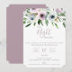 Inbjudan till fest Kvällen Före. Kortet har en elegant trädgårdsblomsterbukett i chic nyanser av vitt, mauve och grönt. Modern och chic typografidesign. Baksidan av kortet, visad i mauve skuggor, kan anpassas.