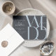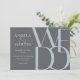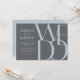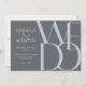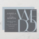 Den enkla men djärva 7 x 5-tums bröllopsinbjudningen i ord, "We Do", i överdimensionerad dammig blå brev på mörkens grått-bakgrund med ljusblå och grått-redigerbar ställe-hållartext för bröllop parets första namn, datum, tid, plats, plats adress med meddelandet i grund vid, "mottagning att följa".