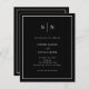 Dessa eleganter, moderna budgetinbjudningar för allt-i-ett-bröllop trycks på ett pappert lakan. De har en enkel vit, minimalistisk textdesign på en svart mörk, med ett klassiskt ram vid gräns. Lägg till initialer eller monogram för att göra dem helt egna. På inbjudningens baksida finns det utrymme för att lägga till gästinformation, samt en skannerbar QR-kod så att gästerna kan OSA online på bröllop webbplats.