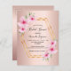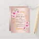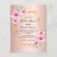En elegant tropiska sommaren inbjudningskort för möhippan. Med ett faux guld geometric ram dekorerat med ljus rosa hibiscus, blommor tropiska blommigtar med en viss grad av grönenergi. En ro-guld tittar metallisk bakgrund. Den brud som ska vara namn är skriven med ett modernt, hanterat stil-skript. Svart text. Baksida: Faux ro guld metallisk bakgrund. Tips! Om du inte vill att det ska se ut som ett vykort klickar du på anpassa, går till baksidan och tar bort delaren och lägger till frimärke.