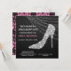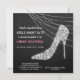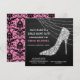 Denna eleganta inbjudan till möhippa har en silverfärgad rhinestone- eller diamantstilett med klack på en dramatisk svart bakgrund. Bakom skon finns en gnistrande ljustrådsdekoration. Din anpassade text är i vitt och rosa till vänster och längst ned. Baksidan av inbjudan har ett gammaldags svart damastmönster med matchande rosa. En kombination av gammaldags charm och modern stil!