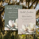 Blommigt inbjudningskort för möhippan-mall med vita magnoliska blommor. För den sydliga bruden dekorerar stora vita blommor grund från den rosa beige papper. Texten är mycket mörk grönt med party rubrik och bridrets namn i modern stil. Ändra titeln för ett lunchte, en möhippa eller en möhippa te. Visas pappert med ett skalat kant, som du lätt kan ändra.