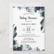 Mörk Blommigt Baby Shower-inbjudan i marin grönt, skog, elfenben och svart på vit bakgrund med ponnyer och fjädrar. Baksidan av inbjudan har ett liknande blommönster.