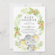 Den berömvärda safari-babyduschinbjudan med sötaste baby-elefant i gult för en könsneutral babydusch med grönt vattenfärg rand tillbaka. Besök vår butik för att se inbjudan till en tjej- eller pojkdusch.