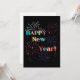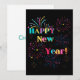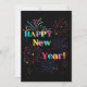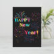 Denna inbjudan presenterar orden "Happy New Year" i ett unikt och djärvt typsnitt med bokstäver i olika färger, fyrverkerier och serpentinströmmar i en nyårsinspirerad stil. Tryckt på klassiskt papper med en tjocklek på 17,5 punkter, obestruken mat finish och en äggskalstruktur, tillverkad och tryckt i USA, med "Cheers!" på baksidan.