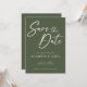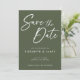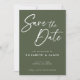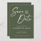 Modern oliv grönt bakgrund med det vita handskriftskortet stil bröllop spara datum. Den här designen har ett stort calligraphy stil-teckensnitt som du kan ändra färg från vitt till valfritt färg. Du kan också anpassa all information och färg i den här Spara datumdesignen.