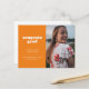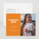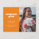 Meddela din stora prestation i student med detta enkla men snyggt studenten meddelande och inbjudan. Den har ord "gratulerar grad" i ett vitt stil-textteckensnitt på orangens bakgrund samt utrymme för ett foto på framsidan. Använda baksidan av vykortet om du vill ha mer information om firande för student.