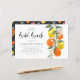 Familjen inbjudan och vänner till ditt evenemang med den här botaniska möhippan brunch-inbjudan. Den har en vattenfärgsgarland med orangar, citroner, blommar av orange och grönenergi med en motsvarande citrusfrukt mönster. Anpassa genom att lägga till information om namn, datum, tid, plats, adress och andra händelser. Denna citrusinbjudan är perfekt för sommartid möhippor. Matchande objekt är tillgängliga.