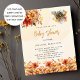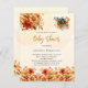 En vit och guldfärgad bakgrund med snyggt. Dekorerad med bin och gult- och orange blommor.. Med texten: Baby Shower skriven med ett modernt handskript i stil. Anpassa och lägga till namn i mamma till att bli. Golden and black brev