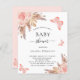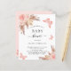 För en modern boho stil babydusch. En vit bakgrund på framsidan. Dekorerad med ro guld och rosa blommigt, rosor, pampasgräs och fjärilar. Anpassa och lägg till information om namn och party. Baksida: rosa och fjäril.