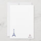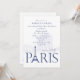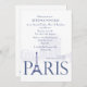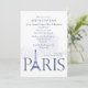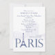 En krispig blå på vit inbjudan med ordet "Paris" med Eiffeltornet i stället för "A". Bakgrunden har en vattenstämpel av stadslandskap. Det här är en mångsidig inbjudan för alla evenemang med ett parisiskt tema. Den delande linjalen kan dras till valfri plats.