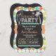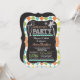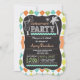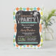 Tropical pension party inbjudan med retro chalkboard, titta typsnitt på klassisk grönt, tårblått, grönt, gult och vit argyle mönster. Inbjudan har krita och ser ut som cocktail och handflatan träd-klippdel med inslag för ritraskdesign. Neutralt för män, män eller kvinnor.