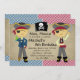 Anpassa den här roligten födelsedagsfest inbjudan med söta pirat-pojkar. Design färg omfattar blå, röd, gult guld, svart och grått. Utformning av ©Inbjudan