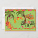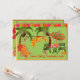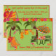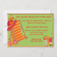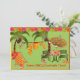 Tropisk grön, gul och orange inbjudan till poolparty för vuxna med grillad mat och cocktails med bland annat strandstolar, badkläder som hänger mellan två palmer, flipflops och cocktailglas med parasoller!