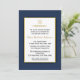 En inbjudan till snyggt Pub Mitzvah med en mörk blått gräns med subtil struktur-effekt. Textområdet är vitt och trimmat i guld och accentueras med en guld Star av David och guld prydnadsblomma. Baksidan är mörk blått.
