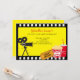 Börja din fest med denna söta inbjudan till filmkväll. Den har alla elementen i en bra filmkväll. Det finns en filmkamera som står upp på vänster sida av inbjudan. Längst ner finns en dryck, popcorn och en biljett. Bakgrunden är gul med en svart-vit rutig kant. Kolla in våra många andra designs och produkter i denna linje. ©Riefka