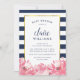 Chicens babyduschinbjudningar har en fetstilt marin blå och vit rand-bakgrund, faux guld foil gräns och en grund gräns av rosa vattenfärgsblommor. Anpassa med dina babyduschdetaljer i marinskriften.
