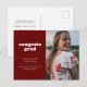 Meddela din stora prestation i student med detta enkla men snyggt studenten meddelande och inbjudan. Den har ord "gratulerar grad" i ett vitt stil-textteckensnitt på mörkens röda bakgrund samt utrymme för ett foto på framsidan. Använda baksidan av vykortet om du vill ha mer information om firande för student.