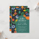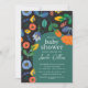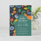 Modern babyduschdesign med stora feta blommor i orangens gult och blått med en modern båge som visar din party-info.