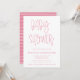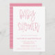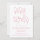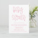 En enkel inbjudan till rosa och vit babydusch med "babydusch" i stort rosa handskriftsteckensnitt, på vit bakgrund. Det omvända är i baby rosa med vit rand.