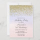 Födelsemeddelandet med guld glitter ser ut och ser ut som rosa och blå vattenfärgsbakgrund.
