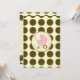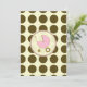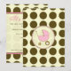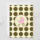 En inbjudan med en brun polka-punktbakgrund över varmt beige med ljusare rosa trim. Anpassa den bruna och rosa teckensnittstexten med information om händelsen. På motsatt sida finns en fast polkprick med en rosa baby-vagn inuti en passande cirkel i ram.