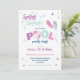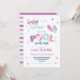 En rolig inbjudan till poolparty i rosa och lila färgskala med randig design på baksidan. Perfekt för en sommars födelsedagsfirande för flickor!