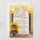 En rustisk babyduschinbjudan med en nalle på bakgrunden med trä och burlap, solros och stiliserade fåglar. Snygg för land stil firande.