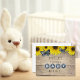 Rustiskt, avvandt trä med gult solrosor med blå fjärilshuvud överst med blå och vit flaska med Baby typografi av blått och vitt lock. Mallar skapat åt dig. #zazzlemade, #rustic, #sunblommor, #bottlecaps, #Landsliv