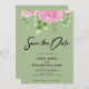 Anpassadet "Spara datum" för Grönt med ro med svart bakgrund och glansigt svart, handskrivet teckensnitt. Den här designen har ett vackert rosa ros och ett stort stil-kalligrafteckensnitt som du kan byta till vilket färg som helst. Du kan också anpassa all information och all färg på den här Spara datummallen.
