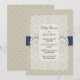 Chicens vintage inspirerade till en babyduschinbjudan utförd i en khaki-färgad schweizisk punktbakgrund tittar av prick. Bilder av ett blått band, över mitten och en rektangulär lacy tittar glatt på ovansidan och fungerar som textområde. Anpassa texten till din babydusch.